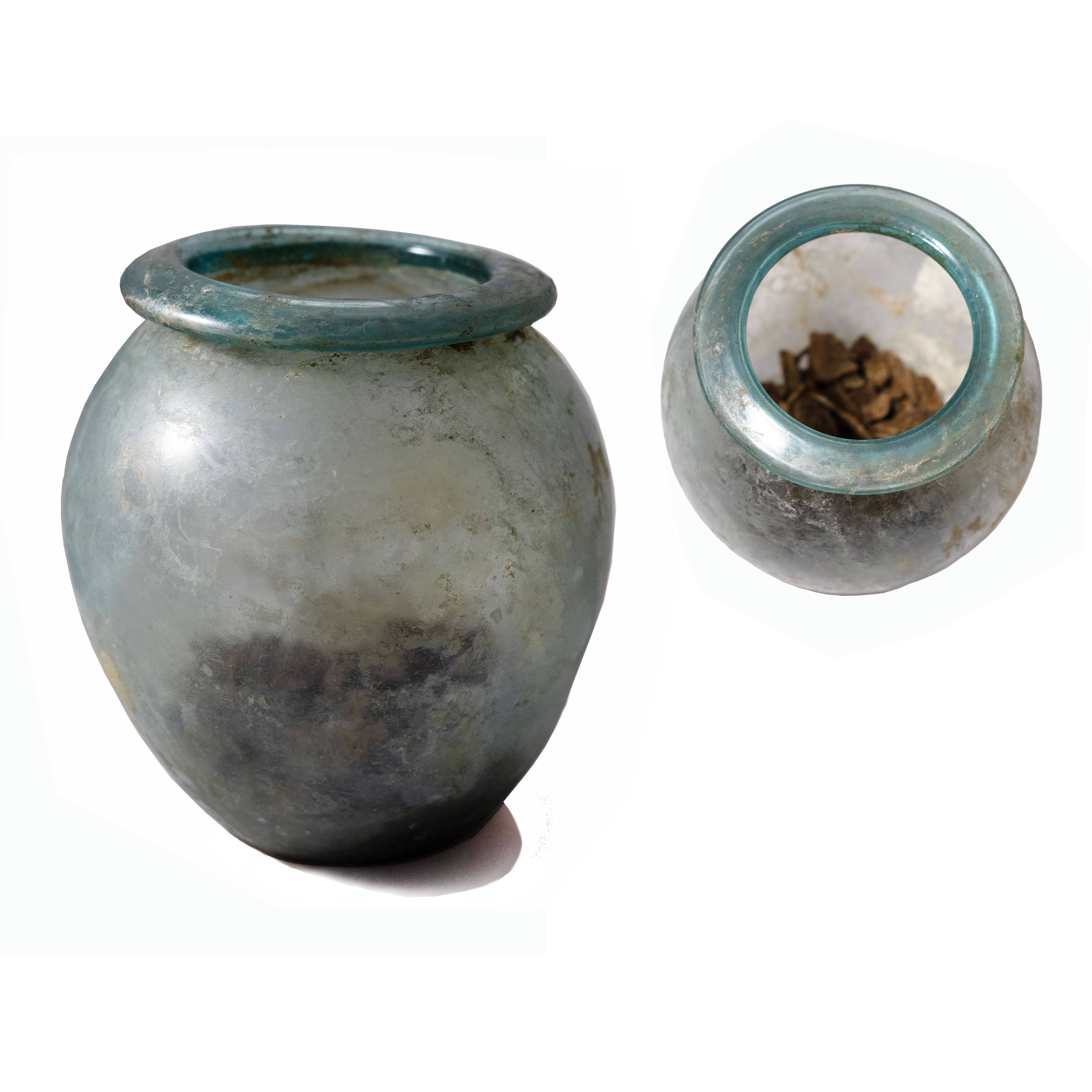 Blown glass cinerary urn, with cremated Roman human remains. A cinerary urn is a container used to hold the ashes of a cremated individual. The term ‘cinerary’ comes from the Latin word ‘cineris’, meaning ashes. These urns served not only as a receptacle for the remains but also as a commemorative object that honoured the deceased.