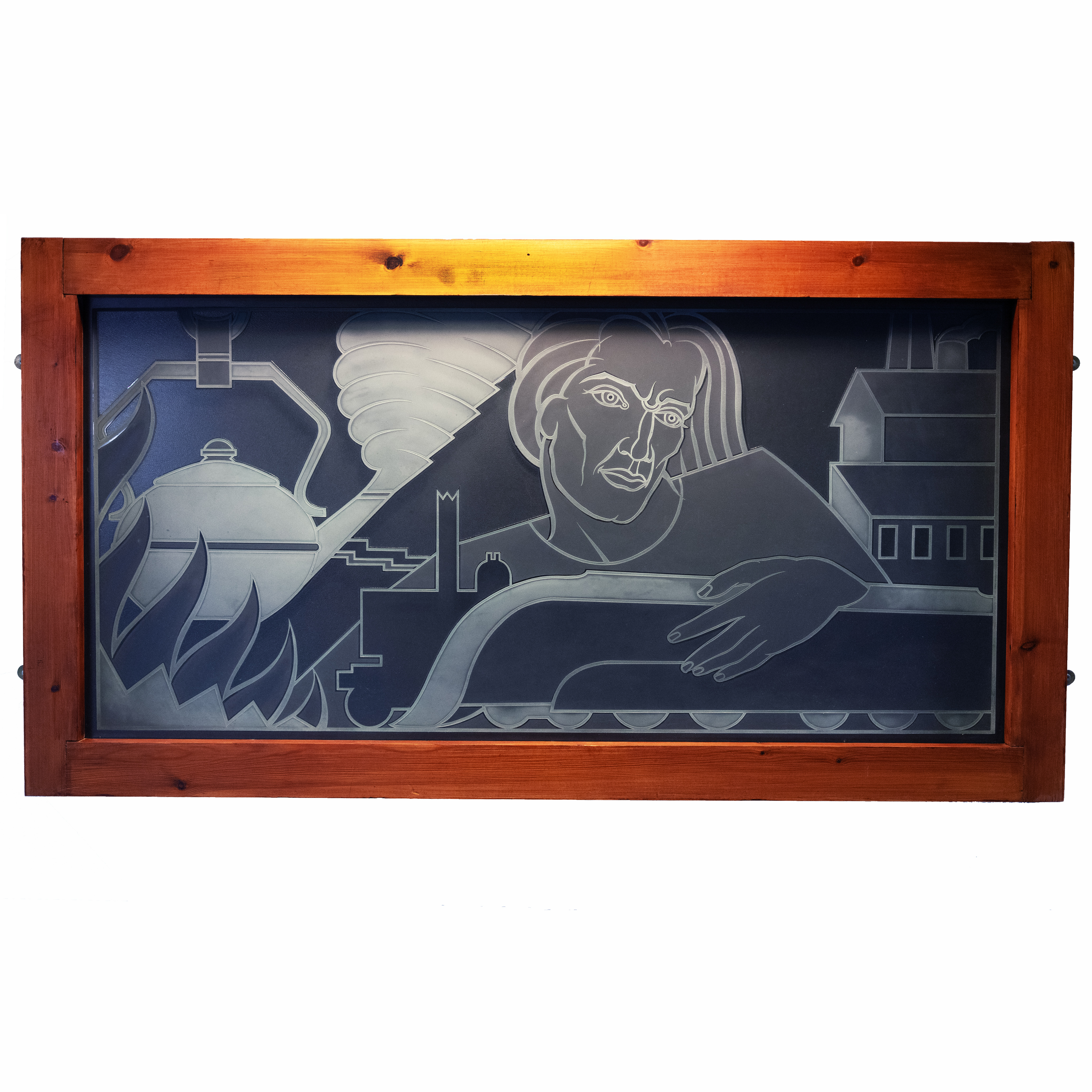 One of a set of 6 glass panels illustrating various types of power in transport which were produced to demonstrate the different techniques of glass working such as engraving, acid etching, sand blasting and stippling.