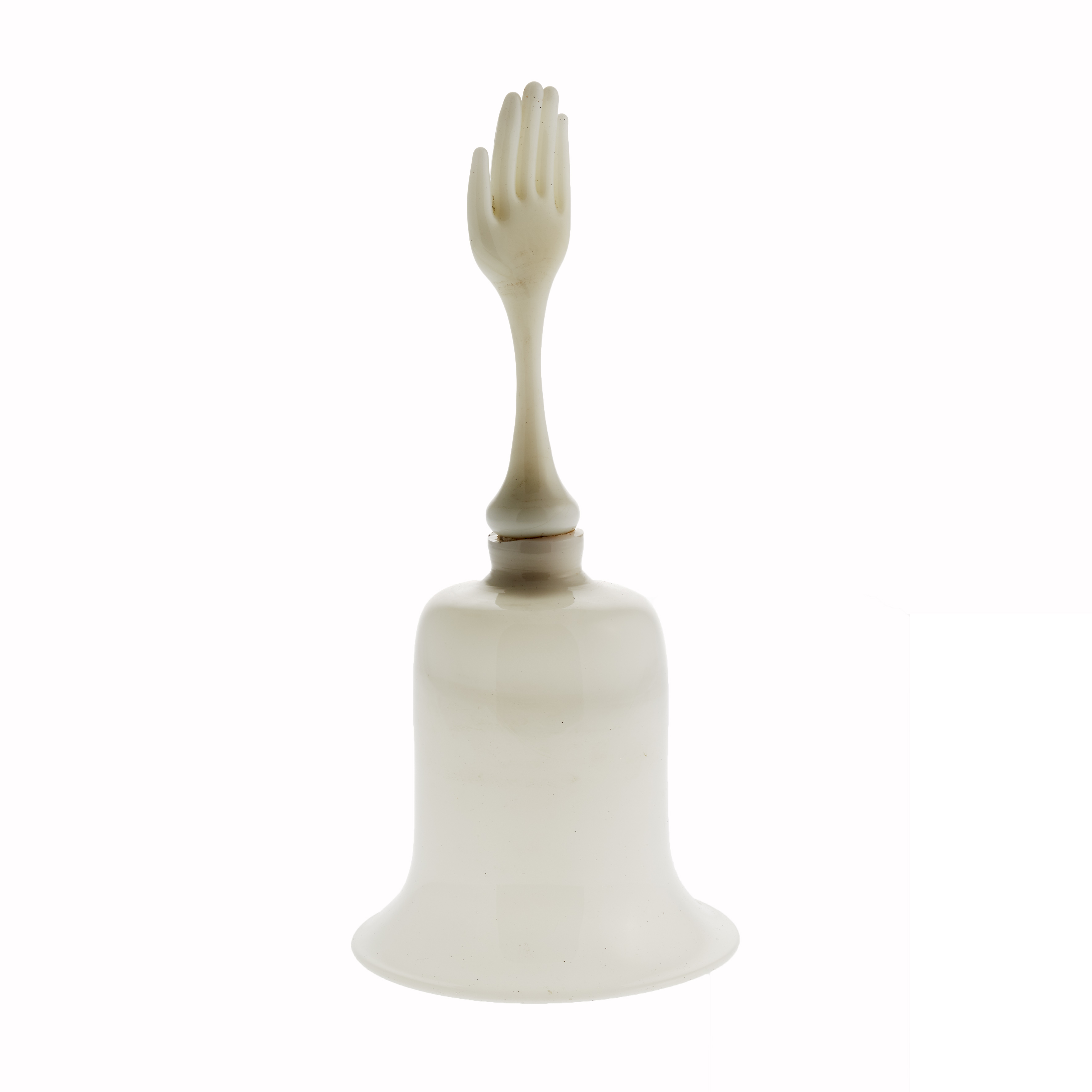 Opaque white glass Nailsea style hand bell with the handle in the shape of a hand and arm stuck to the bell with a plaster type material. The bell is what is known as a ‘frigger’ meaning an object made by a glassworker on his own time using the glass that remained in the pot at the end of the day. They are also known as whimsies.