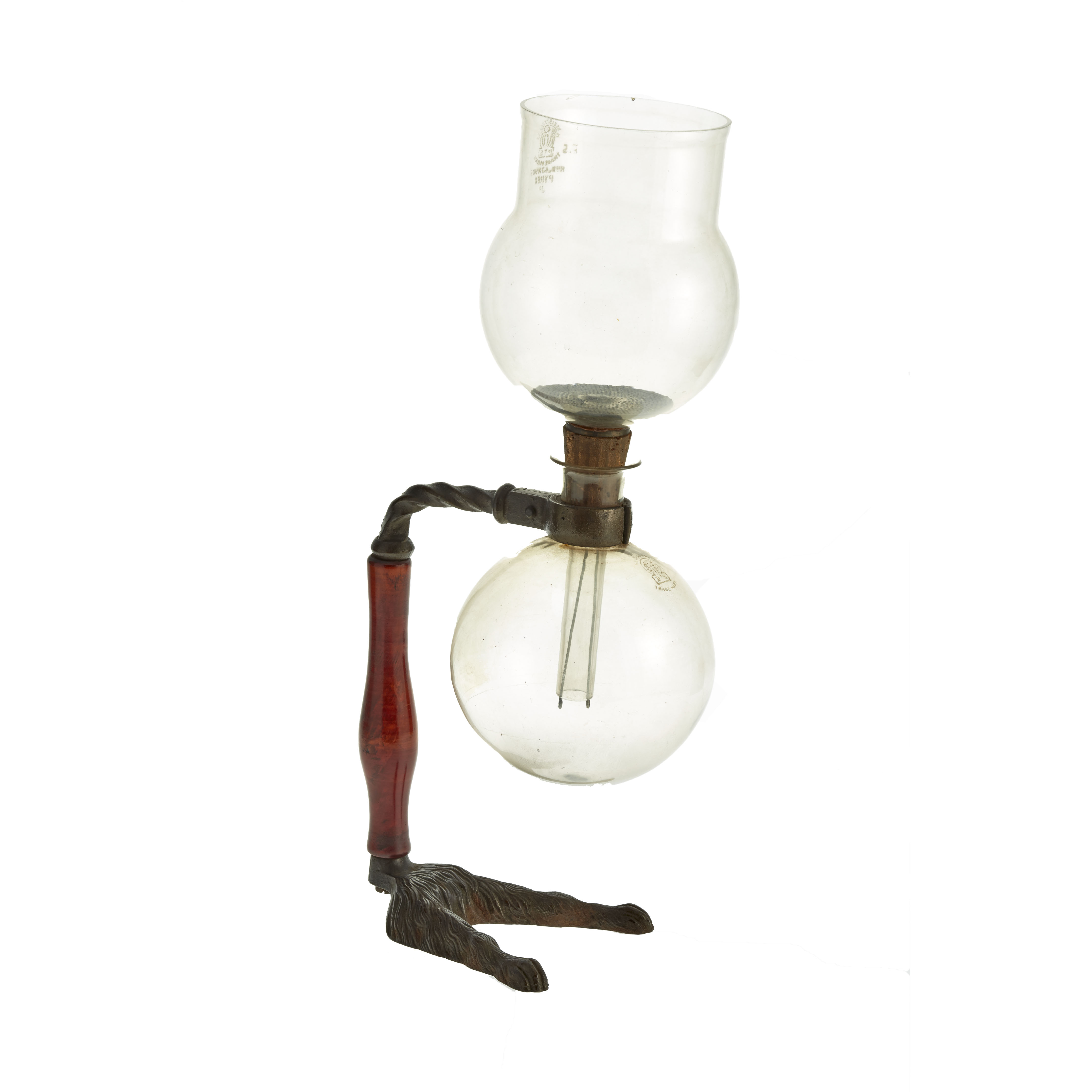 An early application of Pyrex glass, code number “F5 Rd No 678906” with a glass methylated spirits burner, a glass bowl, an upper glass bowl with a metal filter which is held in a metal stand in the form of animal legs with a polished wooden handle.