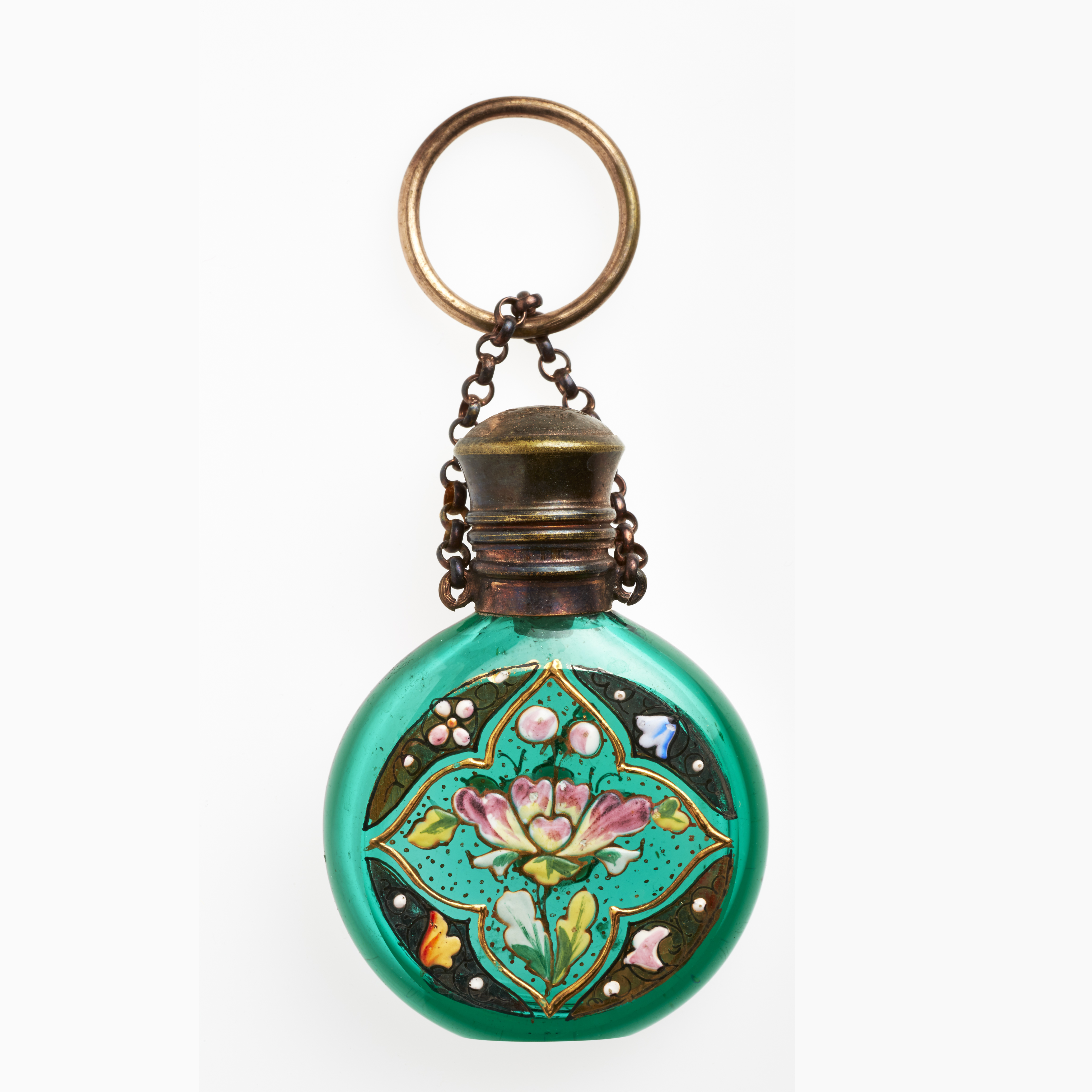 6. Green glass enamel decorated bottle with metal hinged lid 1860 – 1910, England