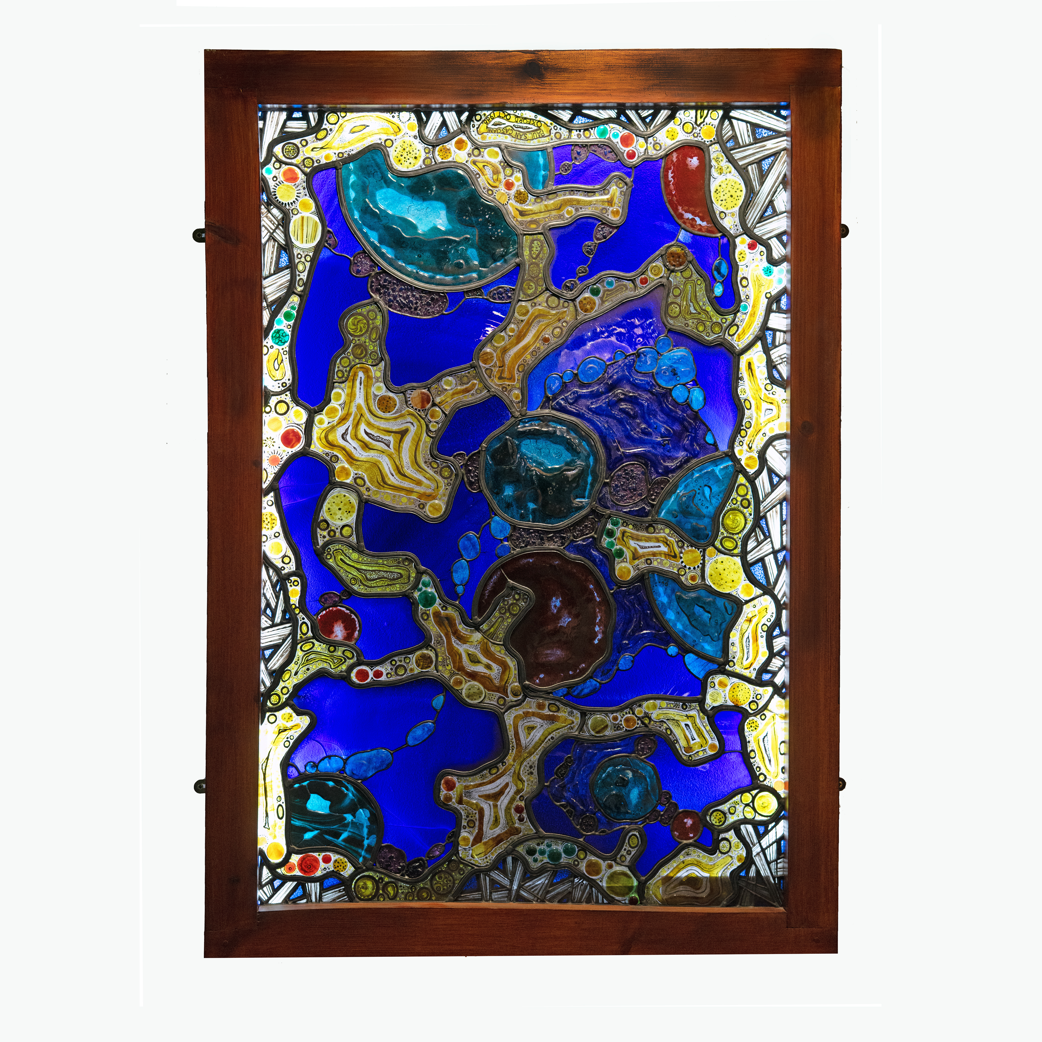‘Animal, Vegetable & Mineral’ designed by Paul San Casciani and made by glass manufactures Hartley Wood & Co Ltd when owned by Pilkington. The panel is based on the concept of matter as seen through a microscope. The design stresses the complex nature of matter.