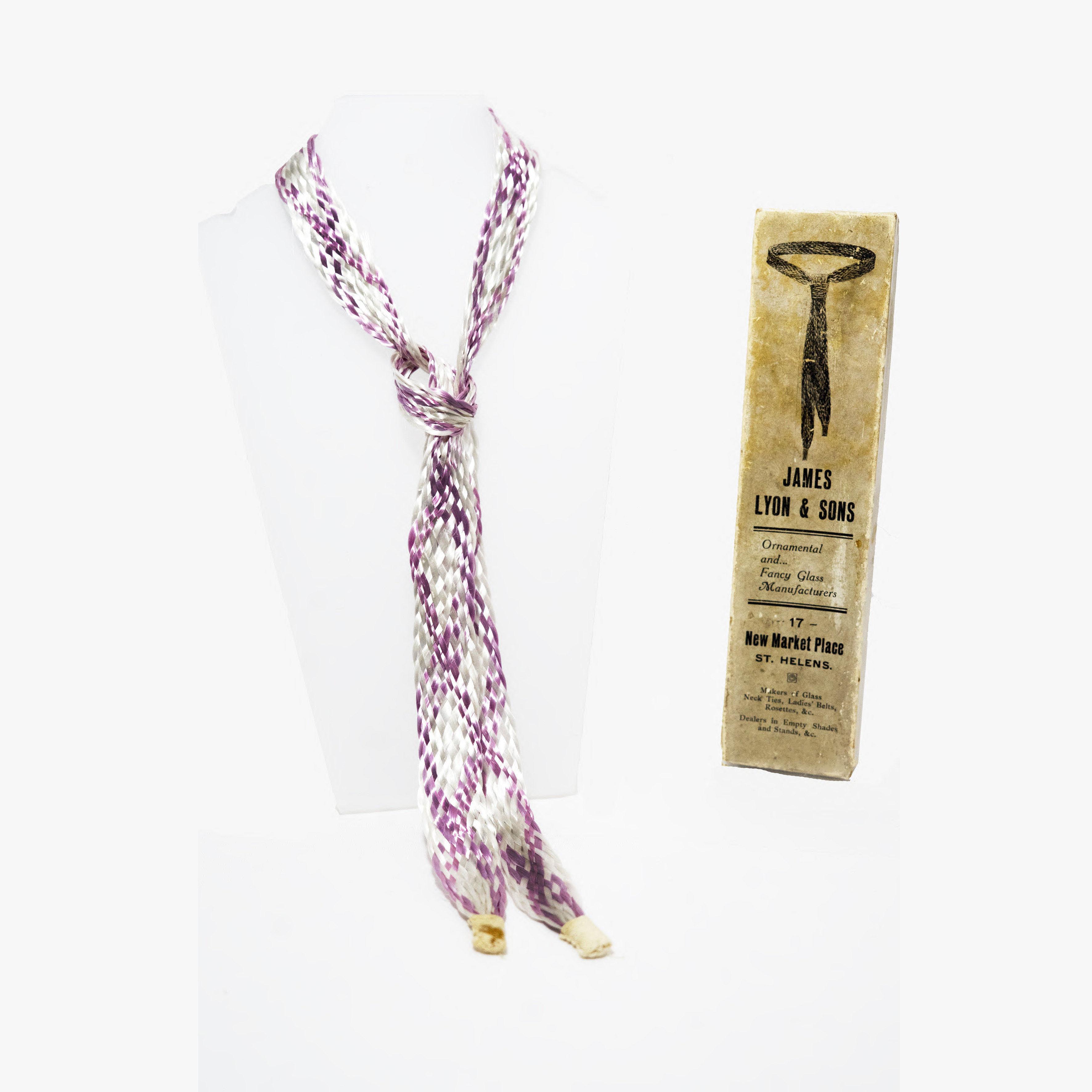 Pink and white Fibreglass necktie in original box made by James Lyon and Sons, Ornamental and Fancy Glass Manufacturers, 17 New Market Place, St Helens.