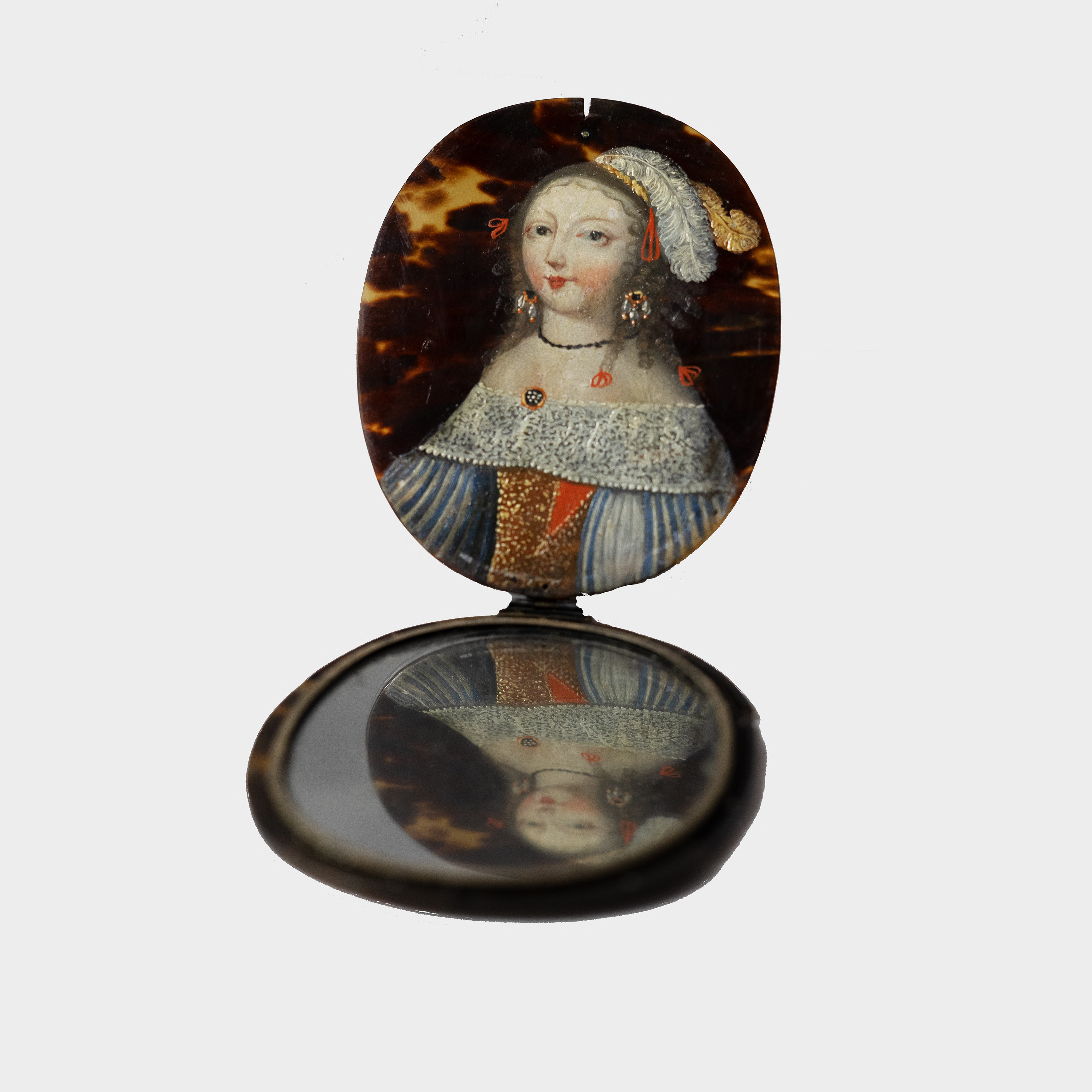Oval, soda glass mirror enclosed in a tortoise-shell case with silver mounts and clasp. On the underside is a rare miniature in colour of a lady, thought to be the Henrietta Duchess of Orleans, with an English hair style decorated with feathers and laces. By the 15th and 16th centuries, glassmakers were producing small, high-quality compact mirrors coated with tin-mercury amalgam on glass, becoming luxury items for the wealthy. During this period French and German artisans began decorating the porcelain backs of mirrors with hand-painted miniatures. Such mirrors were often paired with commodes or vanity sets, reflecting both practical utility and social prestige.